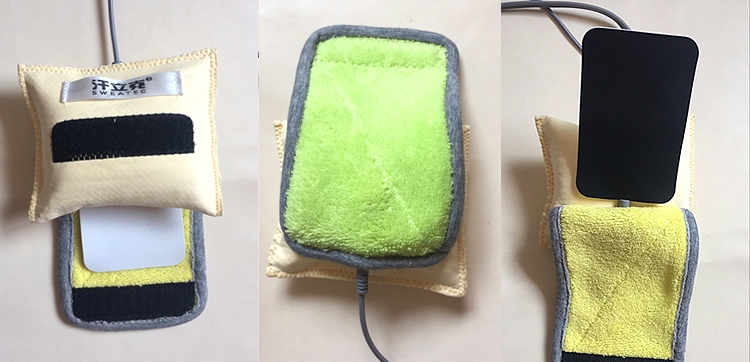 专门为止腋汗而设计,使用方便、舒适,效果高效安全,使用的时候请先将装置用水打湿,,饱含水且不滴水,安装和佩戴方式如上图,软件电极黑色朝向腋窝夹在装置口袋中。